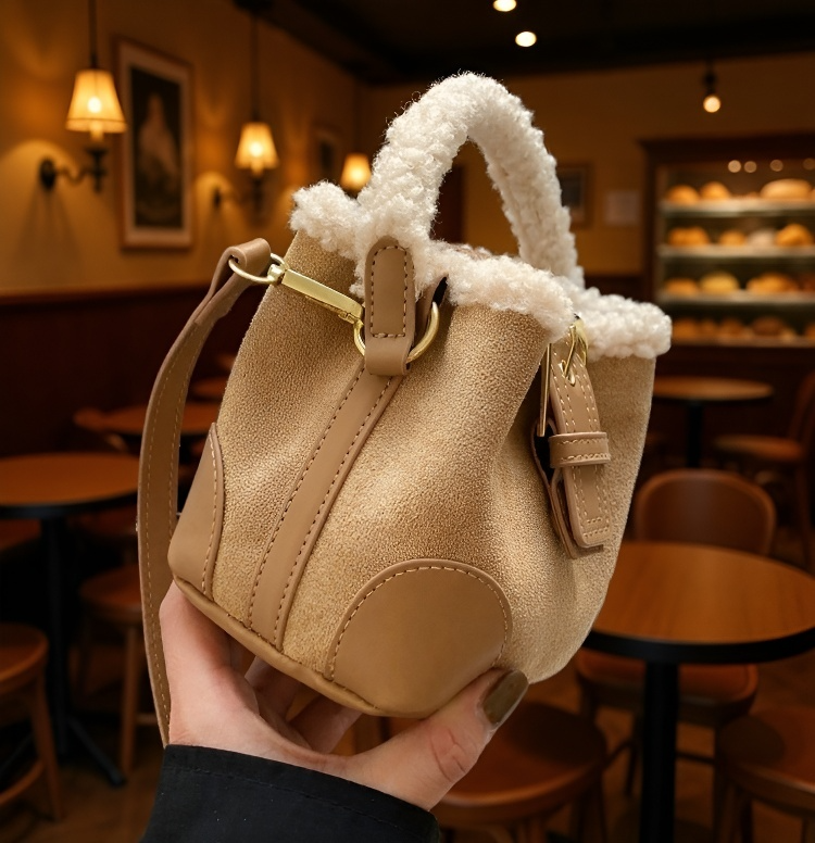 女性が持ったミニバイカラーボアバケットバッグ着用イメージ